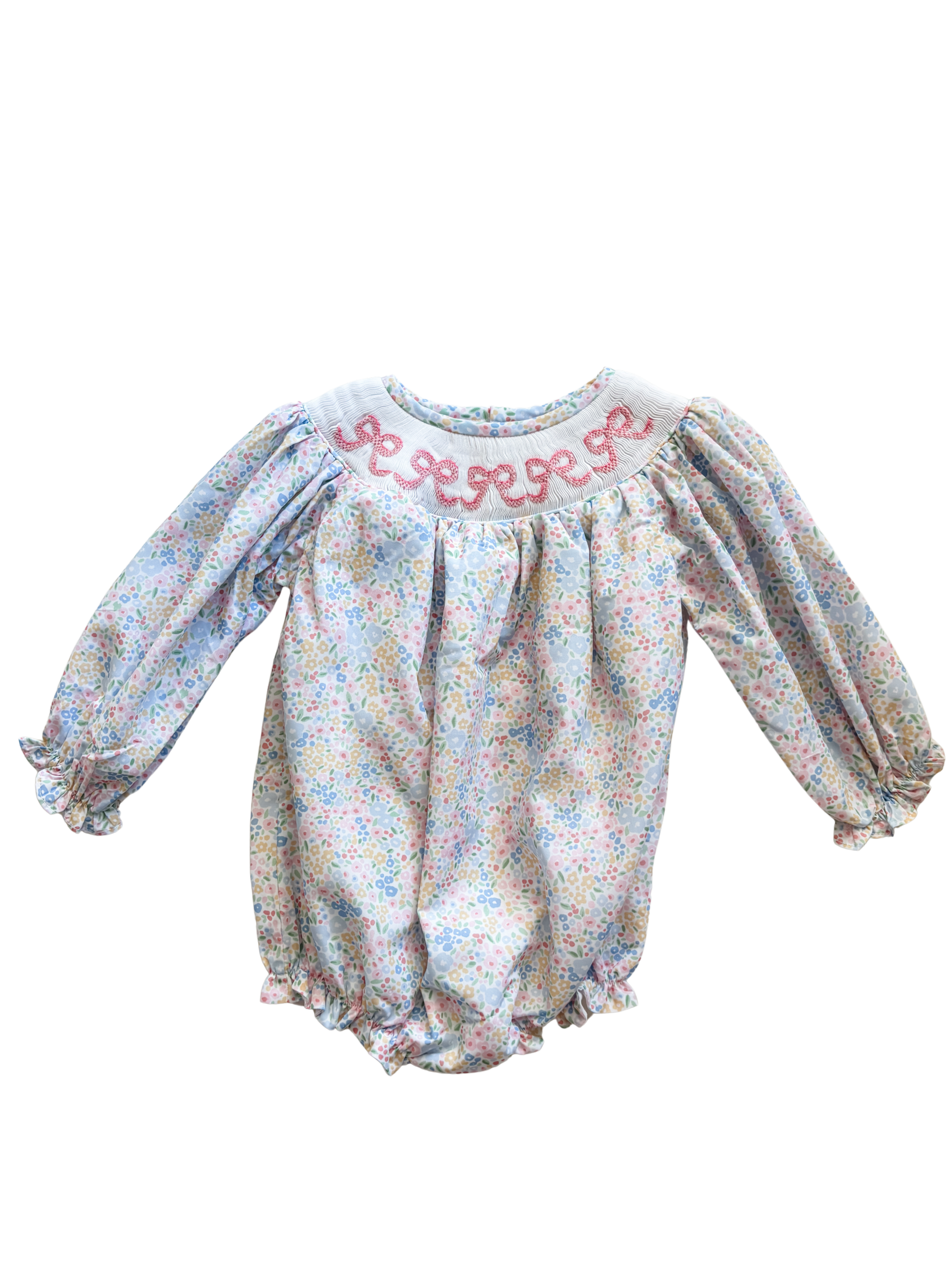 Rylee Faith Designs - Girls Easter Bunny Smocking Embroidered Lace Cuff Purple Romper