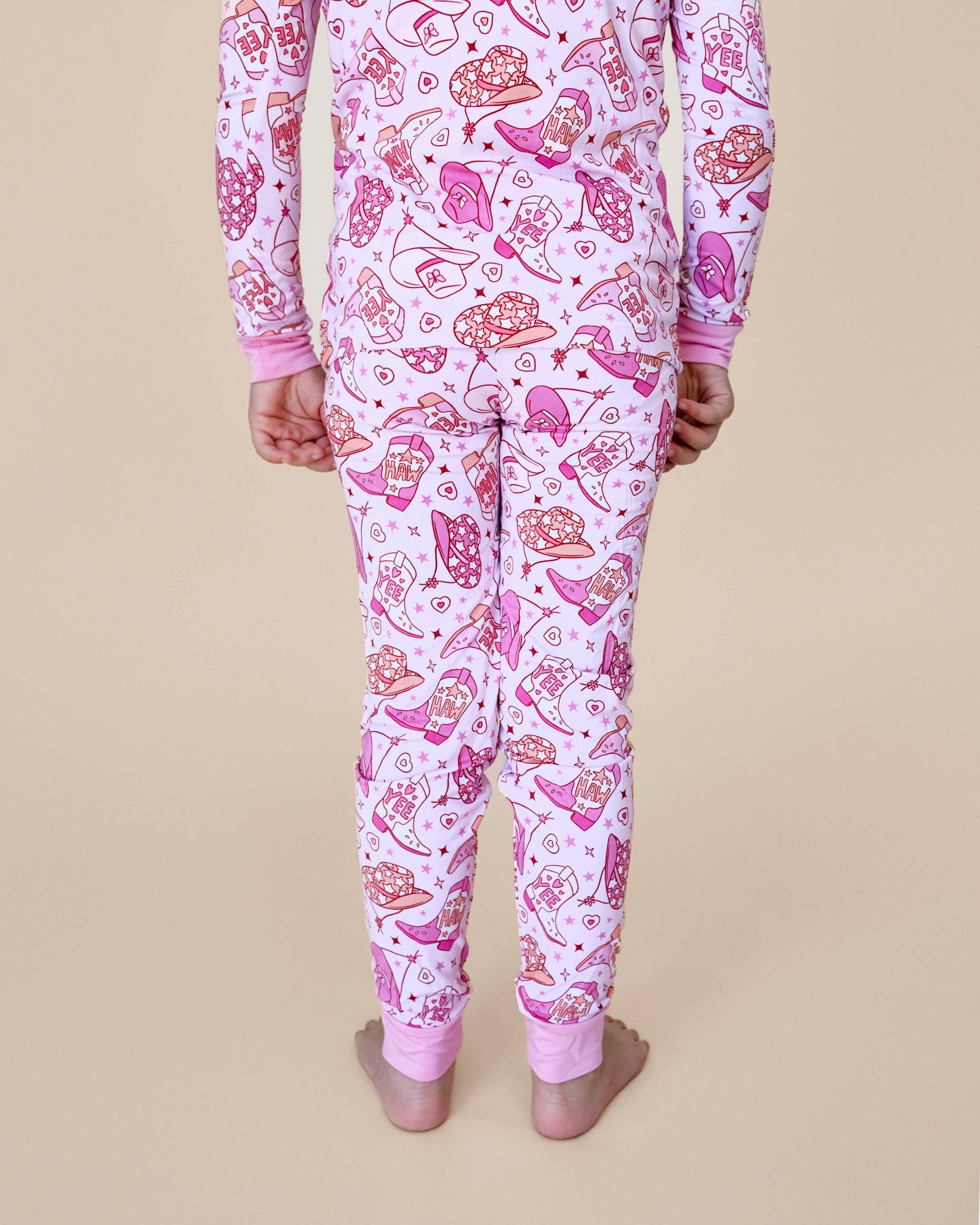 Yeehaw! Your little one will love our Bamboo Two-Piece Set | Cowgirl Cutie! With its fun pink print and adorable cowboy boots, hats, and Western-inspired designs, this set is perfect for playtime, family photos, and everything in between. Crafted from a blend of bamboo viscose and spandex, it’s as soft and stretchy as can be, offering unbeatable comfort for your little cowgirl. Perfect for playtime, naptime, or family photos, this set is ready for all the adventures your little one will saddle up for! Available in sizes 18-24M to 9Y, it’s perfect for bigger cowgirls looking to show off their style.