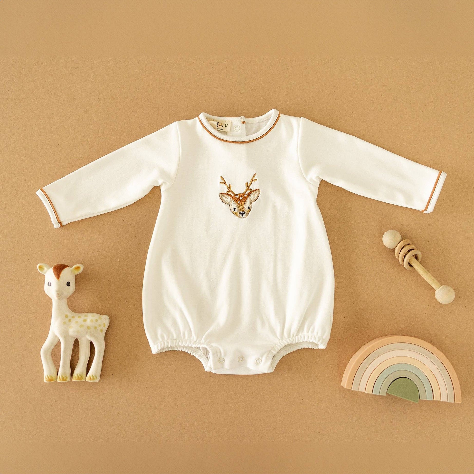 This sweet bubble is perfect for a warm day of exploring. Crafted from luxurious Pima Cotton, it features a hand-embroidered buckhead design on the chest and a practical snap closure at the bottom for easy changes.
